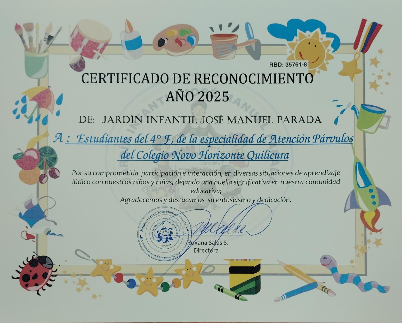 «Por su comprometida participación e interacción, en diversas situaciones de aprendizaje lúdico con niños y niñas, dejando una huella significativa en nuestra comunidad educativa», señala el Certificado.
